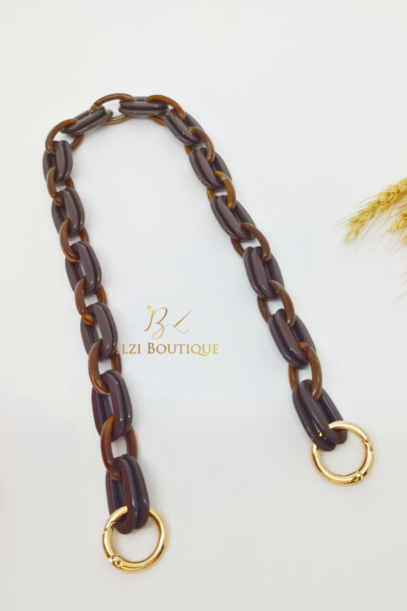 Alça de ombro com elos de resina na cor marrom e argola mosquetão dourado